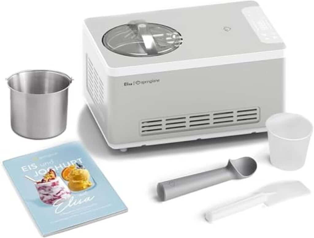 SPRINGLANE Sorbetière et yaourtière Elisa 2,0 L avec compresseur auto-refroidissant 180 W (Argent, avec accessoires et récipient en acier inoxydable)DES RÉSULTATS PARFAITS - En seulement 45 minutes, Elisa prépare 2 litres de glace crémeuse et utilise l'élément chauffant intégré pour transformer le lait en un délicieux yaourt fait maison en quelques heures. POLYVALENT - Ce polyvalent dispose de 4 programmes faciles à régler à l'aide du panneau de commande numérique : glace, yaourt, refroidissement et brassage. Grâce à la fonction de refroidissement automatique, Ellisa garde votre glace finie au frais même après la préparation. PUISSANTE - La sorbetière Elisa ne nécessite aucun pré-refroidissement grâce au compresseur intégré et à sa capacité de refroidissement de 220 watts et prépare la glace au congélateur jusqu'à -35 degrés ÉQUIPEMENT - Elisa impressionne par son compresseur entièrement automatique et auto-refroidissant, son élément chauffant, son récipient à glace et à yaourt amovible, son couvercle avec fenêtre de visualisation, sa partie mélangeuse, son verre doseur, sa spatule, sa cuillère à glace et son livret de recettes. NOTRE PROMESSE – Nous voulons que vous soyez 100 % satisfait. C'est pourquoi nous offrons un service client personnalisé et des retours gratuits.269,99 €